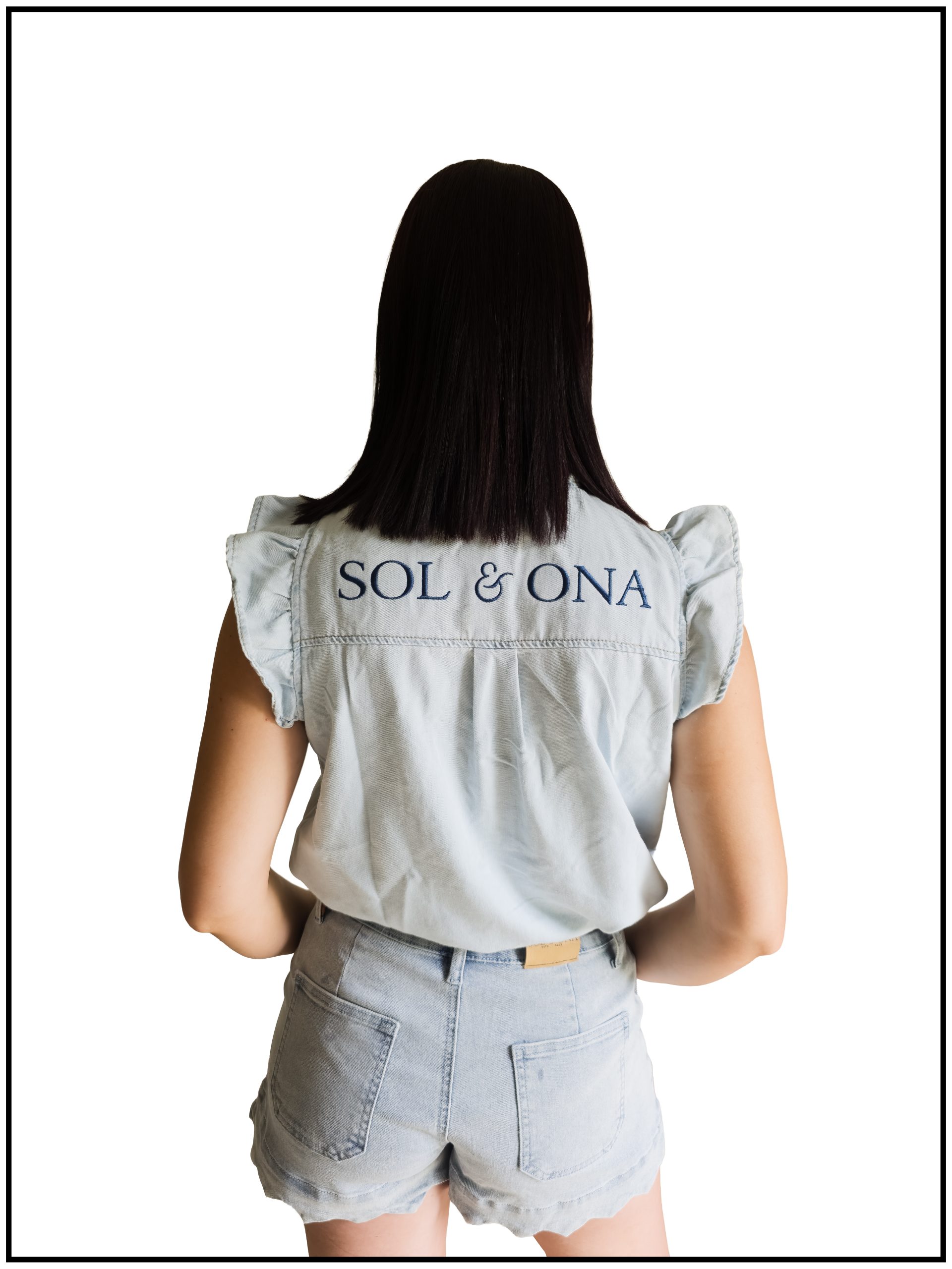 Infuse your look with airy, graceful charm with The Chambray Cascade Top. Crafted from a featherlight, washed denim, this top features a structured yet feminine design, highlighted by cascading V-shaped ruffles across the bodice. The frilled mock neck and delicate flutter sleeves complete the elegant silhouette.