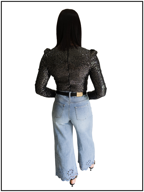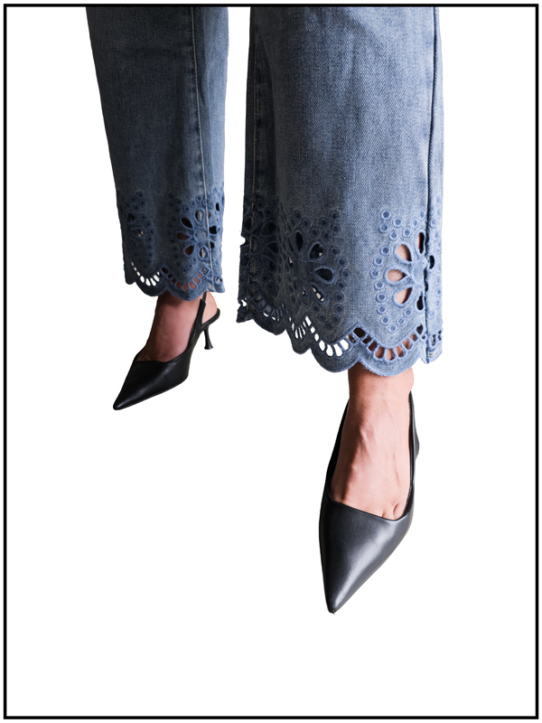 Crafted in a flattering, vintage misty-blue, these denims feature a modern, wide-leg crop silhouette that offers effortless movement. The denim is beautifully contrasted by a meticulously designed eyelet lace hem detail, featuring delicate floral cutouts and a scalloped edge. This elegant finish transforms the traditional jean into a statement piece