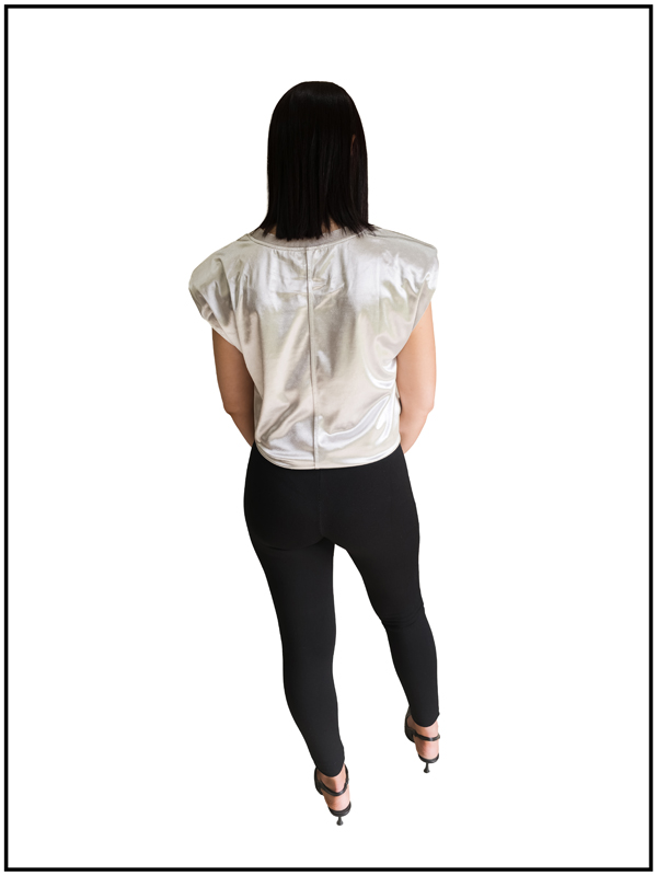 Make a bold, sophisticated statement with The Liquid Mercury Shoulder Pad Tee. Crafted in a shimmering, high-shine metallic silver fabric, this top offers a fluid drape with an architectural silhouette. The design features a modern, wide shoulder line and a relaxed fit, channeling an elevated, futuristic aesthetic.